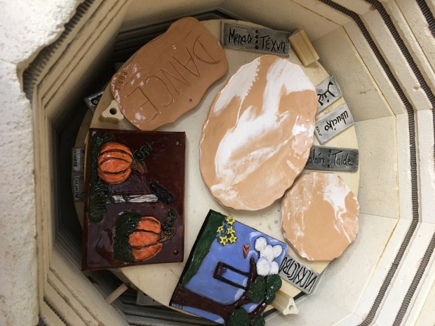 Hand carved exquisite beauty by Caroline, such clear and simple beauty telling the tale. Hand drawn totems by Terri – 2 sides of the same coin as it were…
